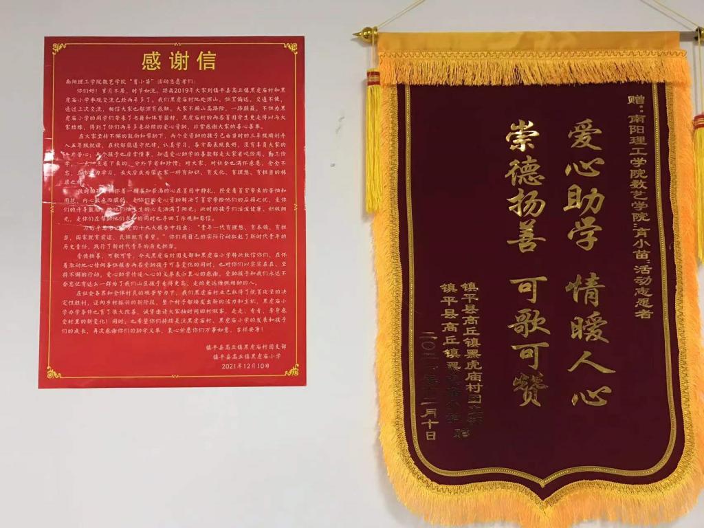 本网讯(特约记者/唐振海)近日,数字媒体与艺术设计学院收到一封来自镇平县黑虎庙小学的感谢信,感谢该院“育小苗”志愿活动的志愿者们。