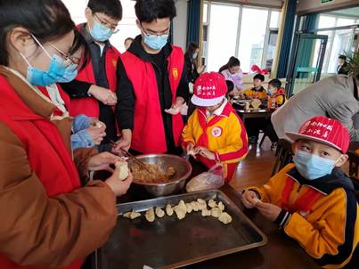 在日间照料中心的休闲康复室,学院同学们和市九小的少先队员们一起为老人们带来精心编排的文艺节目,受到老人们的一致喜爱和好评。随后志愿者们一起为老人们包饺子,在老人们讲述的过往故事中感受祖国的变化与发展,凝聚起矢志奋斗的青春理想。