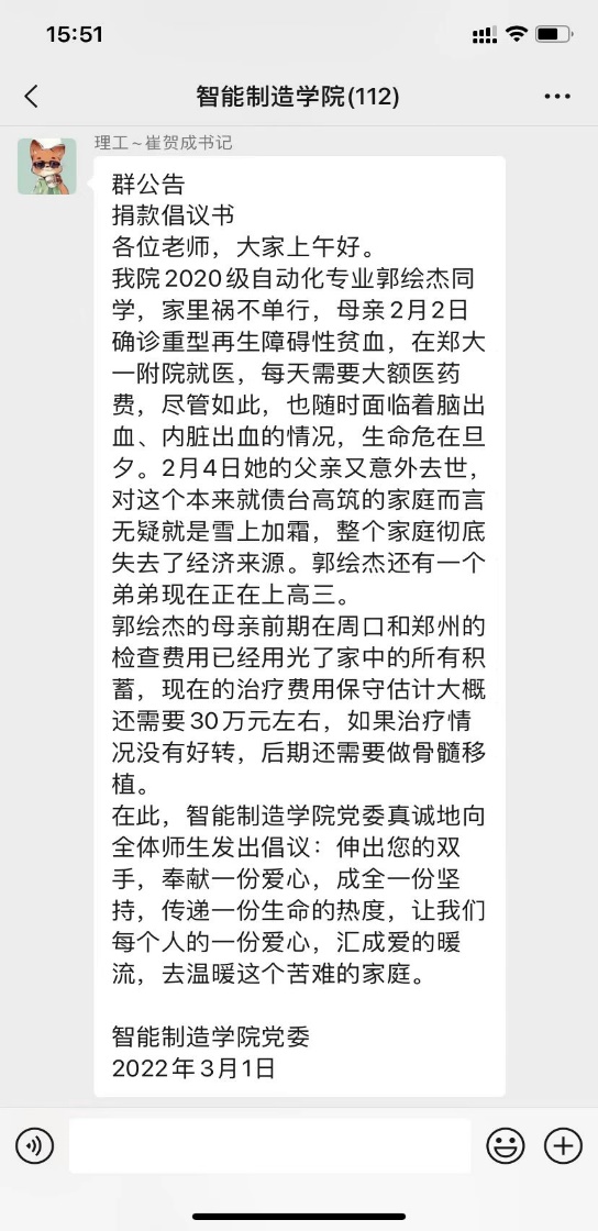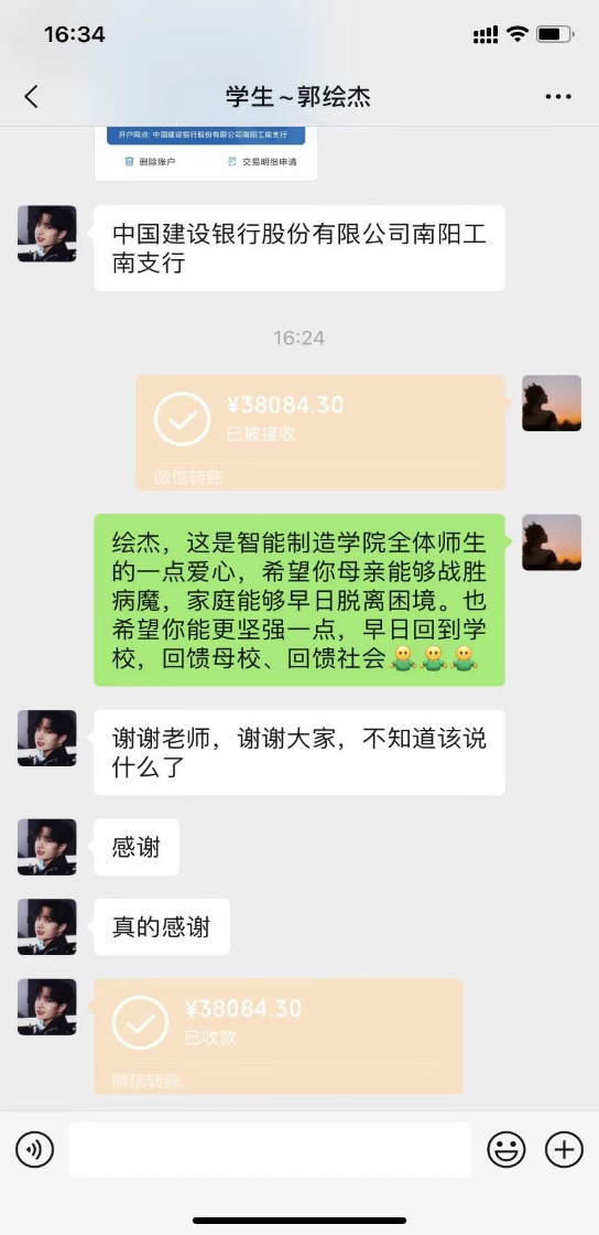 本网讯(特约记者/李媛)近日,智能制造学院全体师生积极开展爱心捐款活动,为学院遭遇困境的20级自动化专业郭绘杰同学提供帮助。