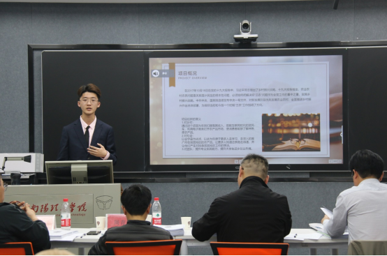 此次比赛由PPT演示讲解、项目答辩、评委评审三部分组成。各参赛队伍着重从项目背景、产品介绍、市场分析、运营策略、未来展望等方面介绍参赛作品,评委老师从专业角度对各团队项目提出意见建议。