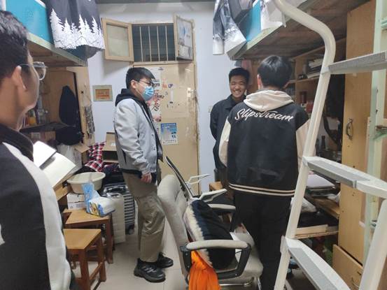 在走访宿舍中,辅导员仔细查看了学生宿舍内务整理、卫生安全以及通风消毒等情况,向同学们再次传达了疫情防控和宿舍安全的重要性,并与同学们就学业情况、职业规划、考研出国等内容进行了深入交流。辅导员提醒同学们,要加强防疫意识,做好个人防护,疫情期间戴好口罩,非必要不外出,时刻保护好自己。申玮鼓励大家,要勤勤恳恳地学习好专业基本知识,扎扎实实地掌握好科研实践操作技能,在此基础上也要切实保证自身作息时间与饮食规律,劳逸结合,要走出宿舍、走向操场,积极进行体育锻炼。