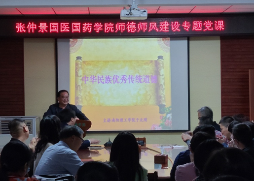 本网讯(特约记者/王猛 刘征)听专家用心诠释道德,提升师生精神文明修养。4月27日,张仲景国医国药学院全体教师党员和第一学生支部学生党员在11教211召开专题党课学习。本期学习由校党委统战部部长于元明主讲。