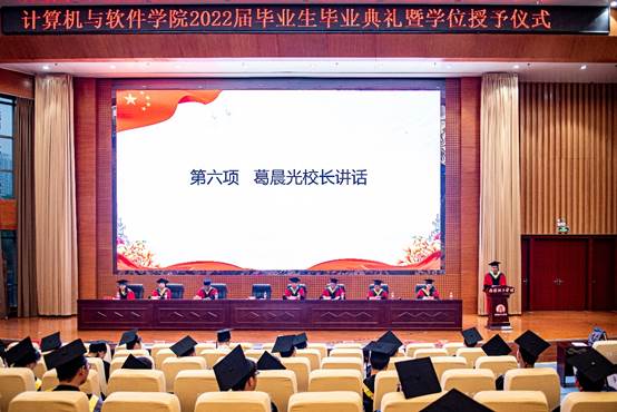 本网讯(特约记者/曾智 闫恒瑜 学生记者/曹纪鑫)5月31日,计算机与软件学院2022届毕业典礼暨学位授予仪式在第三报告厅隆重举行。副校长葛晨光、党委学生工作部负责人、计算机与软件学院领导班子、毕业班辅导员及校内部分毕业生代表出席典礼,典礼由学院党委副书记主持。同时,本次毕业典礼通过哔哩哔哩和抖音平台面向校外2022届毕业生同步直播。
