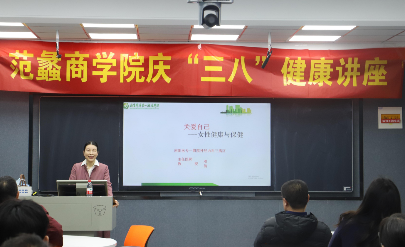 学院邀请南阳医专第一附属医院主任医师邓倩为学院全体教职工开展“关爱自己一女性健康与保健”女性健康知识专题讲座。讲座中,邓医生就生活中常见多发疾病、慢性疾病等作详细介绍,并向大家普及面对疾病应该如何预防与调理,为大家上了理论知识丰富、操作指导性强的健康知识课。