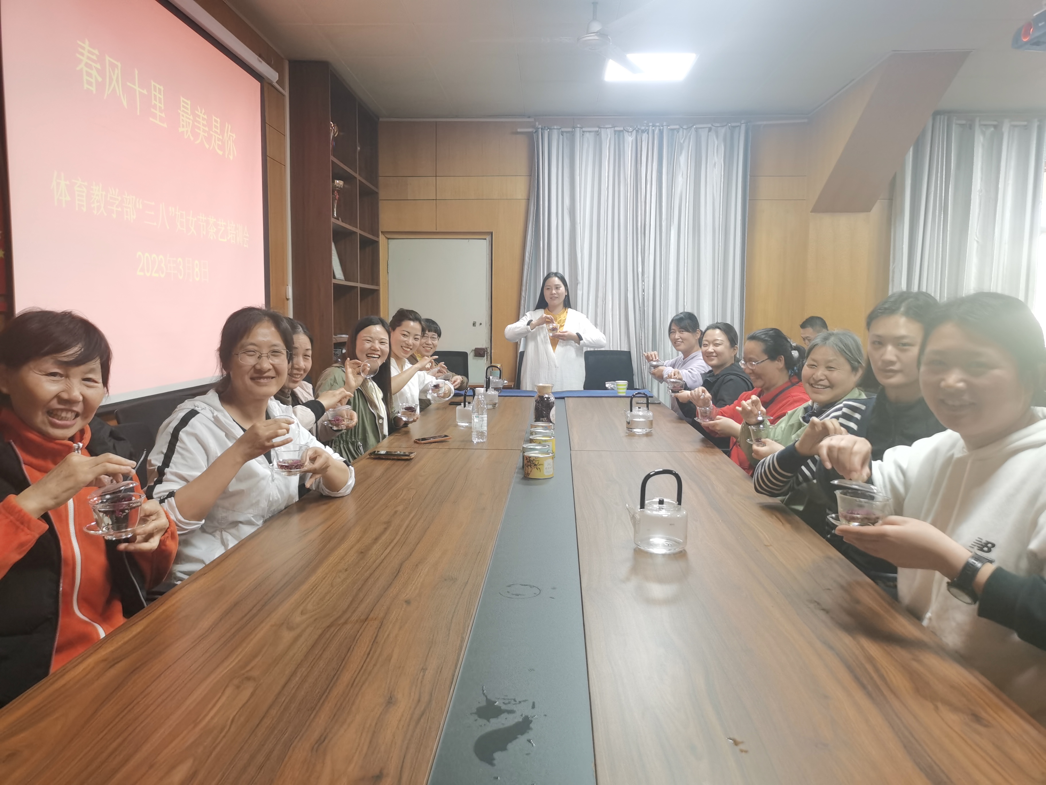 本网讯(特约记者/徐驰)为更好展现女性风采,进一步提升体育教学部女教工幸福感,丰富精神文化生活,营造温馨祥和、积极向上的氛围,3月8日,体育教学部分工会开展“春风十里 最美是你”庆祝“三八”妇女节茶艺活动。