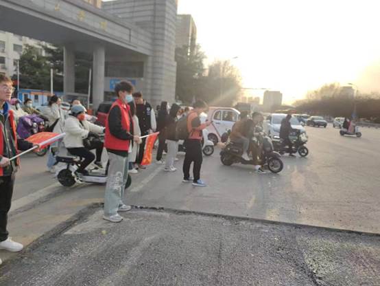 志愿者们身着红马甲,在人流车流密集的学校北大门协助学校保卫处维持交通秩序,为行人指引道路;在公交站台值守,提醒乘客注意上下车秩序,帮助老年人上下车。志愿者的规范引导和文明服务成为校门口的一道靓丽风景。