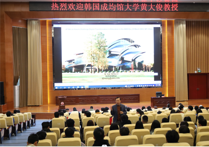 本网讯(特约记者/胡晨曼)3月23日下午,韩国成均馆大学黄大俊教授(南阳理工学院特聘教授)在第三报告厅为全校师生作“AI赋能时代的教育数字化转型”专题报告,计算机与软件学院领导班子及近400名师生代表参加报告会并现场互动交流。