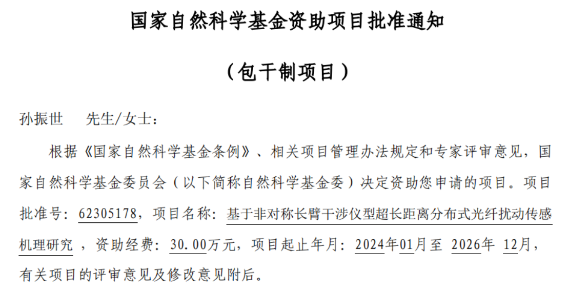 本网讯(特约记者/白秋阳)8月24日,国家自然科学基金委公布了2023年集中接收申请项目的评审结果,信息工程学院青年教师孙振世博士申报的《基于非对称长臂干涉仪型超长距离分布式光纤扰动传感机理研究》青年基金项目喜获资助,资助金额30万元。