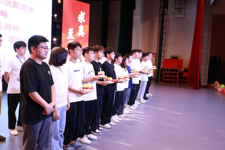 刘书营代表学院向2023级新生表示热烈欢迎和祝贺,并为当日恰逢生日的8位新生送上生日祝福和礼物。他强调,“苟日新,又日新,日日新”,希望2023级新同学,从今日起,从此刻起,牢记师长教诲,不负时代教诲,不负时代责任,汇聚向上向善的力量,成为有理想、敢担当、能吃苦、肯奋斗的新时代大学生。