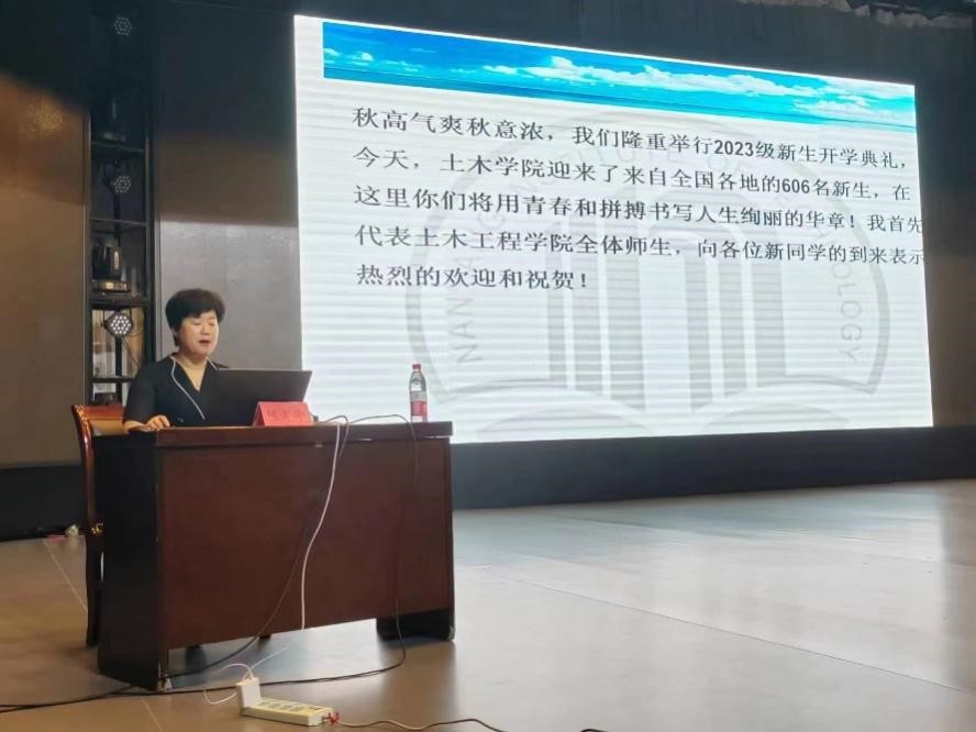 院长陈孝珍为2023级新生讲授开学第一课。讲解土木工程专业历史、现状和发展趋势,勉励大家掌握新的学习方法,适应新的学习环境,在崭新的大学生活中“启航新征程,扬帆再出发”。(摄影/曹振川 校对/李德胜 审核/赵东江 责编/谭萌)