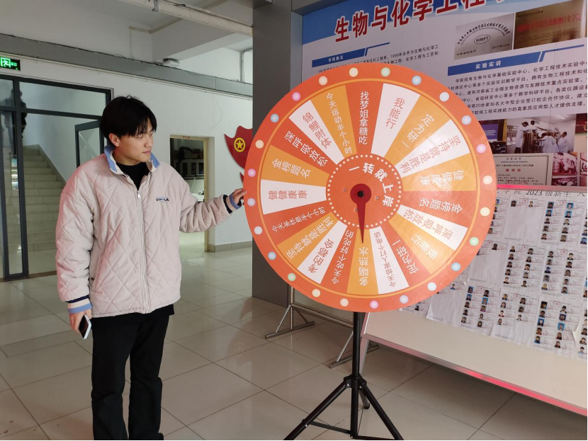 老师们代表学院为考研学子送上美好祝愿,对同学们坚持学习、逐梦考研、勤学不殆的态度给予赞扬和肯定,鼓励同学们要持之以恒,完成考研战场“最后一公里”。老师们为考研学子分发精心准备的“暖心加油包”,包括心想事“橙”甜橙味维C泡腾片,“得分”德芙巧克力,以及“好运旺旺”旺仔QQ糖、解压捏捏乐等礼物。此外,学院设置“一转就上岸”大转盘,帮助同学们调整心态,缓解压力。一件件贴心的礼物,一句句真切的话语,满载着全院师生对考研学子最真挚的祝福。