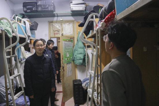 学院党委书记康磊带领学院学工队伍深入学生宿舍开展安全隐患排查工作,强调消防安全,提醒同学们务必注意财产安全、用电安全和人身安全,谨防各类诈骗,并鼓励大家加强身体锻炼,保持宿舍环境卫生。