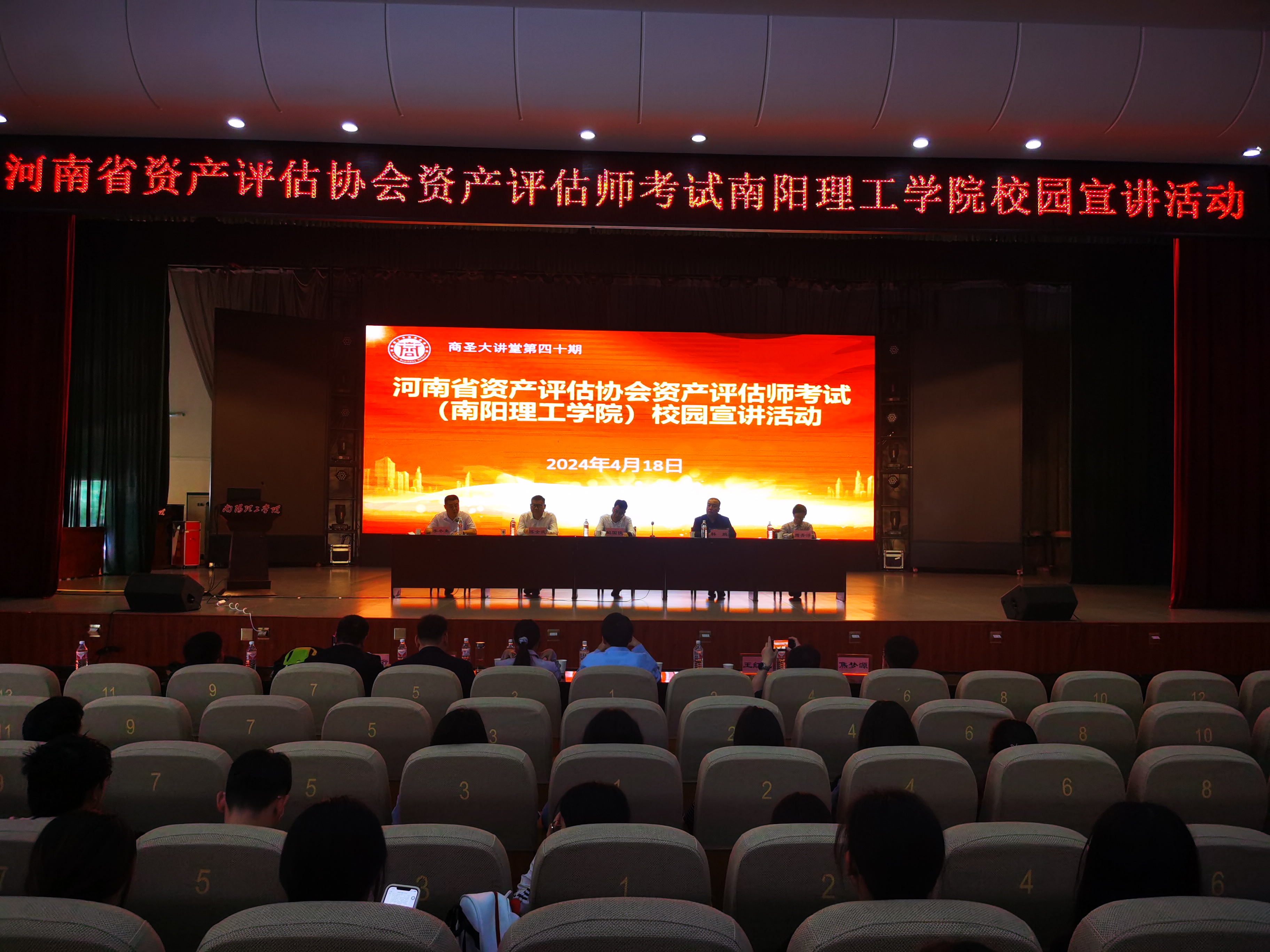 本网讯(特约记者/李浩)4月18日,河南省资产评估协会资产评估师考试校园宣讲活动暨商圣大讲堂第四十期在我校毕业大厅隆重举行。河南省资产评估协会秘书长鲍国俊,主任王红纪、焦梦源,南阳市财政局资产评估管理办公室主任韩鹏,南阳市资产评估协会秘书长陈全武出席会议,河南省资产评估协会和范蠡商学院相关部门负责人、财务管理教研室教师等参加会议,范蠡商学院380余名相关专业学生参加学习。