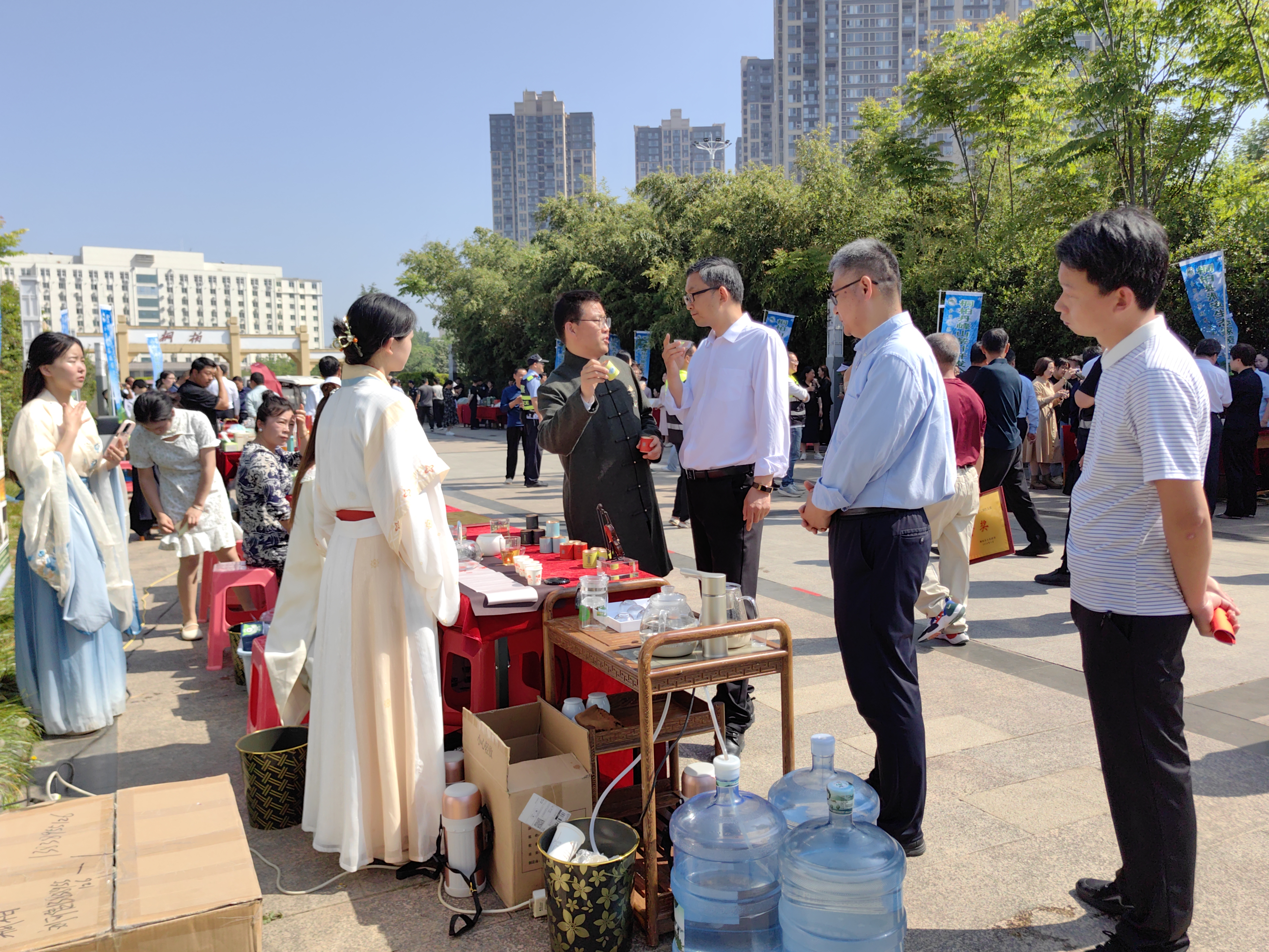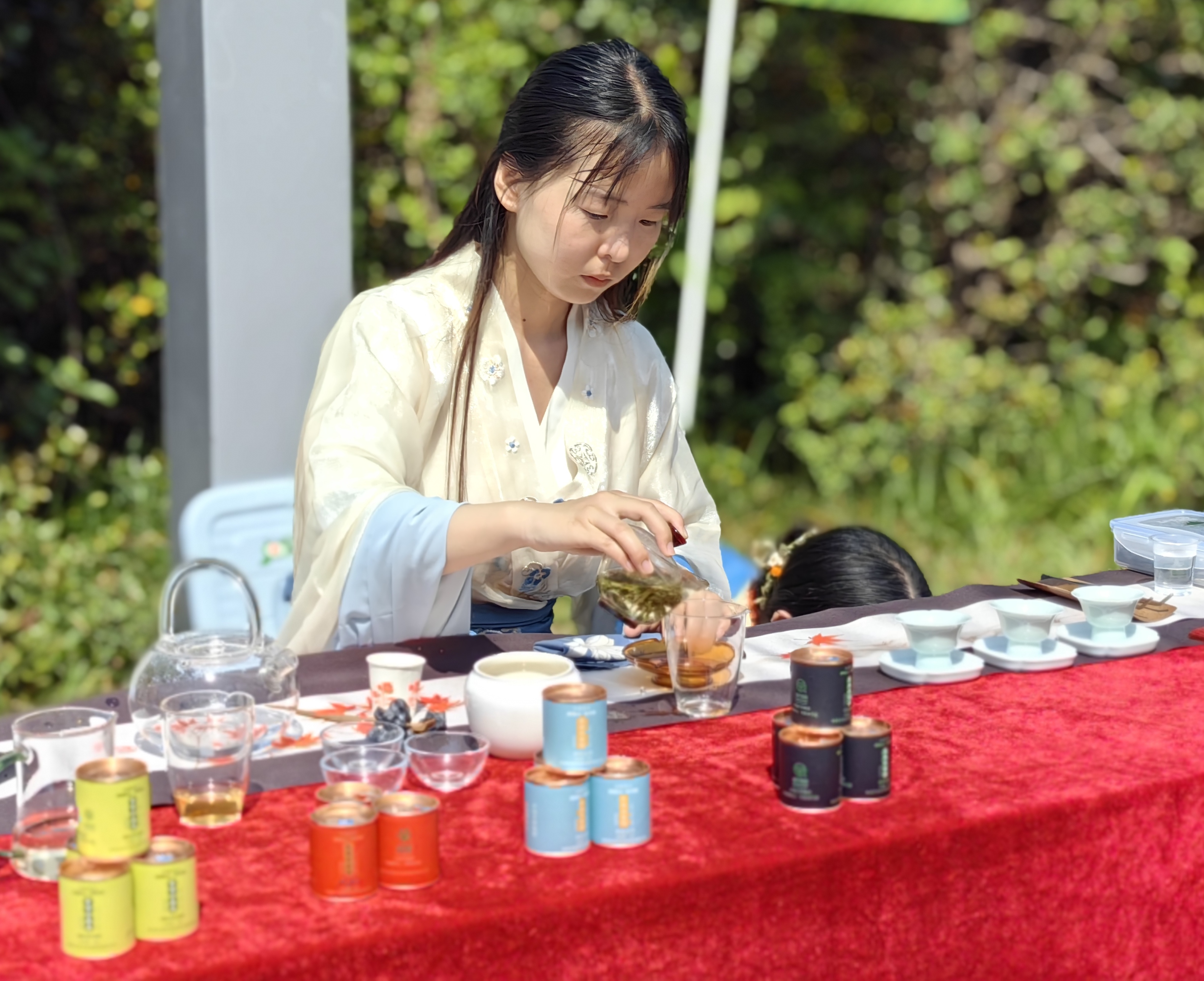 逾新茶艺社成员身着汉服,在活动中进行茶艺表演并细致讲解茶知识,观众沉浸在品茶、观看茶艺表演、聆听茶知识的快乐之中,现场茶香四溢、其乐融融。