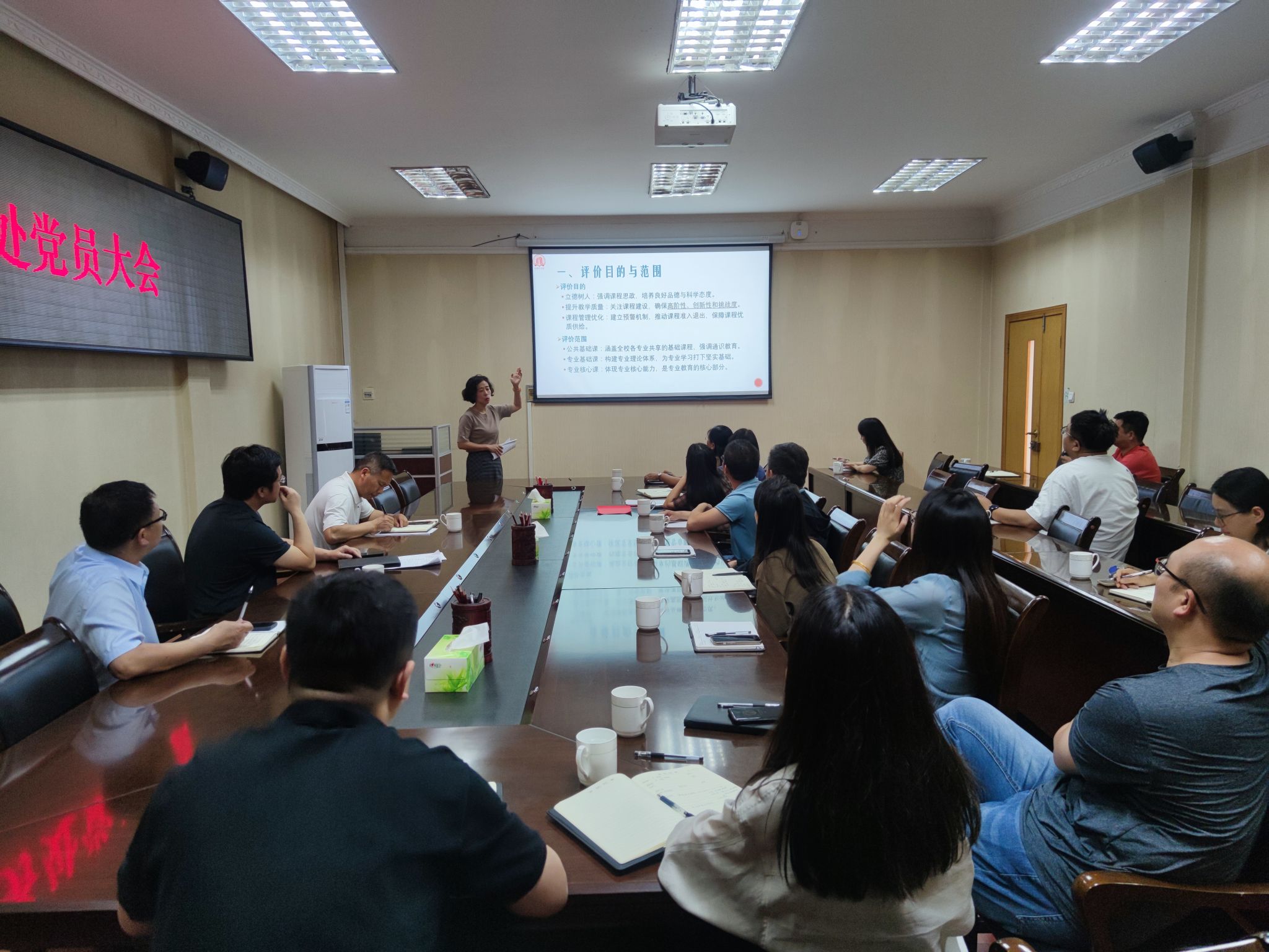 教务处处长吴战勇指出,要充分发挥课程质量评价的引导、诊断、改进、管理等激励功能,推进课程改革创新。他强调,教务处全体人员要带头认真研读课程质量评价文件精神,深入理解各项评价指标的含义和要求,对照标准逐项改进,提高自身授课水平,以评促建、以评促改,以评促管、以评促强,推动学校专业建设和课程建设实现新突破,全面提升人才培养质量。