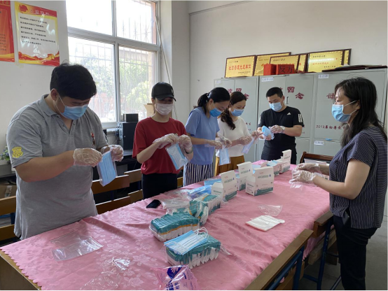 老师们在细心分装口罩