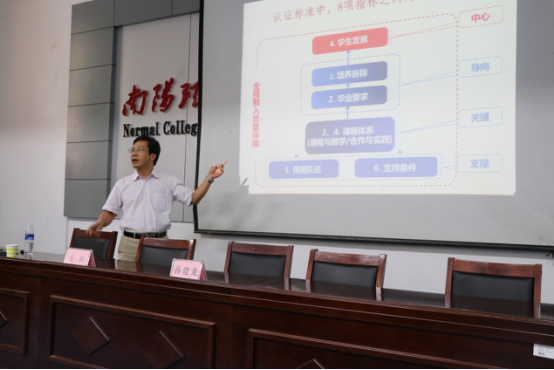报告会上,孙建龙教授从师范专业认证的基本背景、认证理解、认证工作基本流程、认证标准的主要内容等方面,分享了首都师范大学在小学教育专业认证工作过程中的经验与做法,结合首师大等院校的认证经验及师范学院实际情况,为做好师范专业认证准备工作提出建议。他强调,培养目标、毕业要求、课程与教学三大方面是认证的核心和难点,认证过程不是“写材料”写出来的,而是落实、改进“做”出来的,它需要一个梳理、发现、改进、落实的过程,应该从积极的、促进专业发展的角度去认识和落实这项工作,坦然面对问题,谋划持续改进。