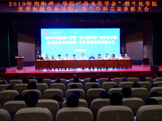 本网讯(学生通讯员/叶丽靖 金雨豪)9月26日晚,生化学院在毕业大厅举行2019年“奋飞奖学金”暨优秀班级学业导师和学生学科竞赛表彰大会。南阳市京德啤酒技术开发有限公司董事长仝奋飞、生化学院领导班子成员及全体教师、700余名学生参加会议。会议由副院长罗建成主持。