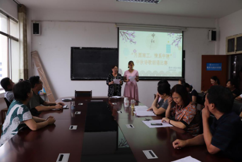 下午三点,老师们和学生代表齐聚会议室,开展“月圆南工,情寄中秋”诗歌诵读比赛,首先由学生代表朗诵《桃李满天下是给您的回报》,为老师们送上教师节和中秋节的“双节”祝福。接着由老师代表李瑞阁和王国欣朗诵《水调歌头》、仝云旭和刘阳朗诵《八月十五夜月》、乔俊峰朗诵《美丽中国》等,一首首动人心弦的诗文抒发着大家对亲人和故乡的思念,以及对祖国的美好祝福。