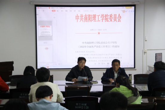 党委书记康磊领学《中共南阳理工学院委员会2022年全面从严治党工作要点》,要求广大教师党员一要坚持政治统领,切实做到“两个维护”,筑牢思想根基,推动巡视巡察上下联动;二要坚持党建引领,提升党组织创造力、凝聚力、战斗力,逐步夯实基层党建基础,提升干部队伍能力;三要坚持系统施治,持续强化监督检查,提高思想觉悟,一体推进不敢腐、不能腐、不想腐;四要坚持加固堤坝,不断巩固中央八项规定精神成果,组织开展“不担当、不作为、乱作为”“形式官僚主义”专项整治;五要坚持自我革命,深化整治监督,贯通监督责任,依规依纪问责,不断增强监督治理效能。