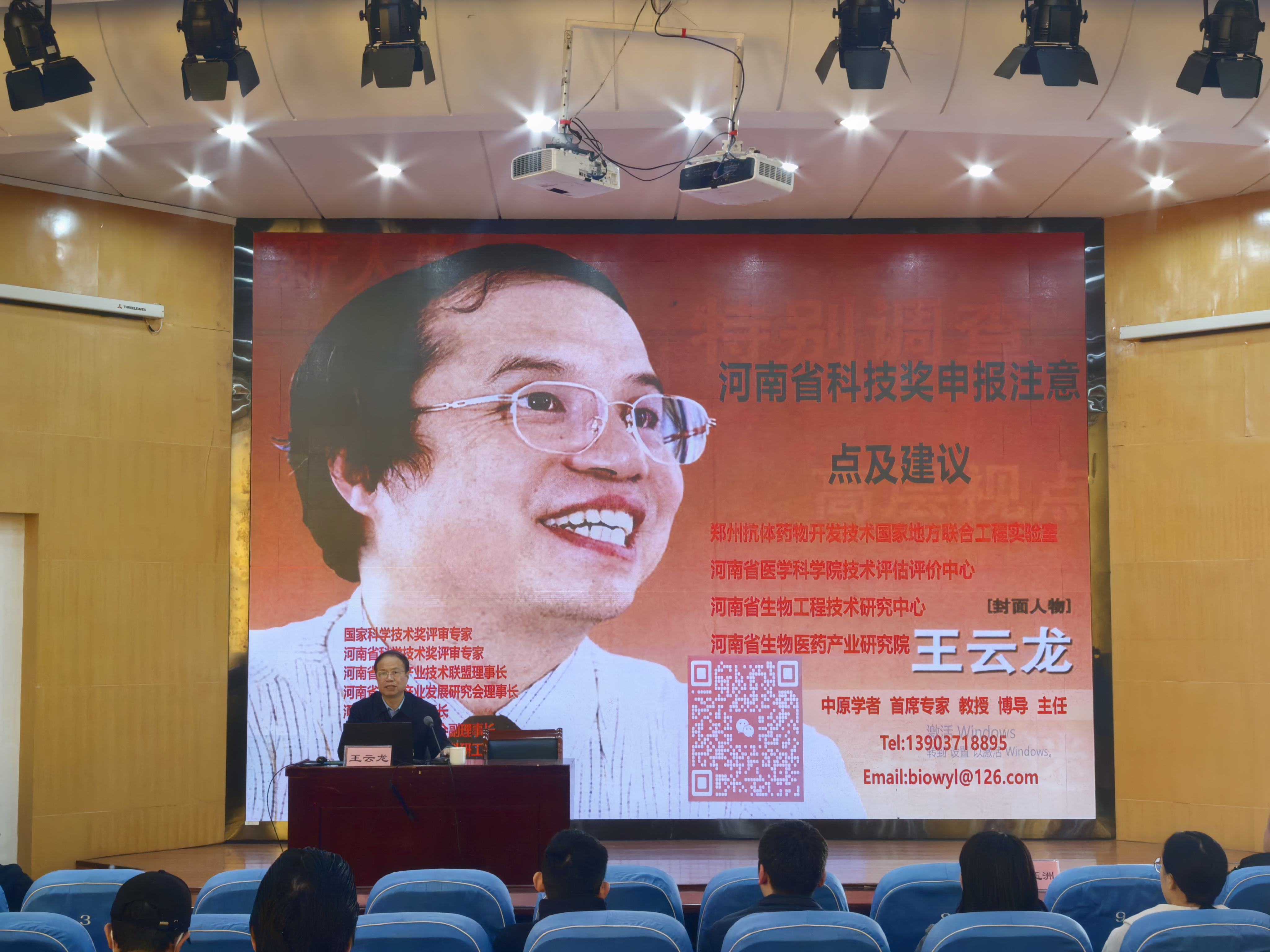 本网讯(特约记者/赵骏)4月2日,中原学者、河南省生物工程技术研究中心主任王云龙教授应邀来校开展河南省科学技术奖申报指导讲座。培训会由科研管理处处长司马玉洲主持,相关院部院长、主管科研副院长及科研骨干教师参加培训。