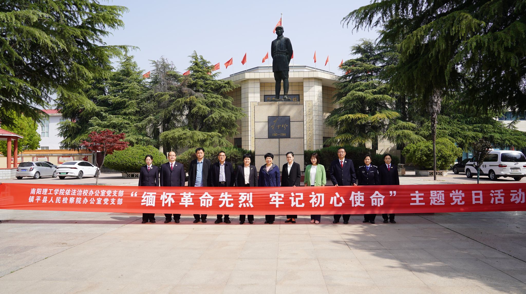 本网讯(特约记者/生阳)4月10日上午,副校长高芳放带领依法治校办公室党支部全体党员一行与镇平县人民检察院办公室党支部,联合开展“缅怀革命先烈,牢记初心使命”主题党日活动。通过重温入党誓词、聆听彭雪枫将军革命故事,在沉浸式革命体验中强化政治担当。本次活动也是落实教育部、最高人民检察院《关于加强新时代检察机关与高等学校合作的意见》的重要举措。