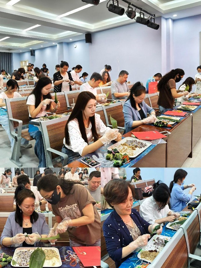 活动现场,老师们热情高涨,在专业厨师的指导下学习包粽子的技巧。大家互相交流、协作配合,从折粽叶、填糯米到捆扎成型,体验传统手艺的乐趣。活动不仅增进了同事间的感情,也让教职工们更深入地了解了端午节的习俗与文化内涵。