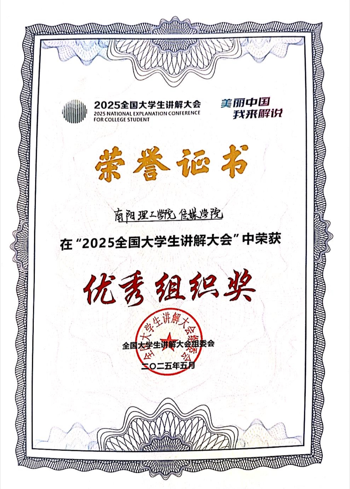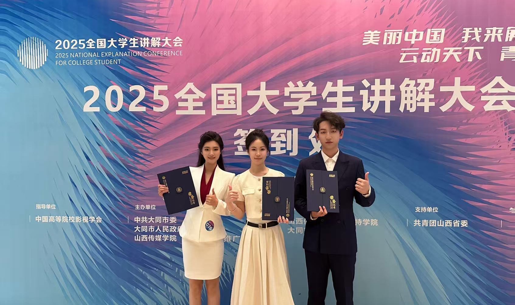 本网讯(特约记者/吴倩倩)5月16日至23日,2025年第二届全国大学生讲解大会在山西大同落下帷幕,传媒学院播音与主持艺术专业孙境晨、贾甜甜、杜若涵同学荣获大会“优秀奖”,南阳理工学院传媒学院获优秀组织奖。