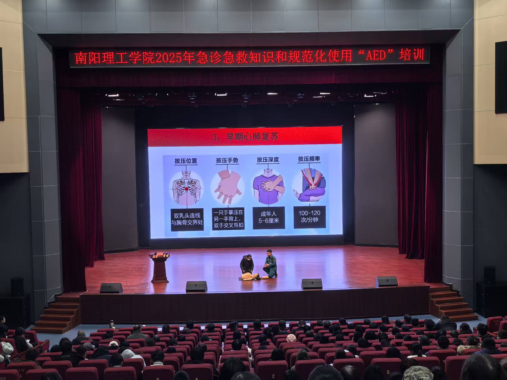 本网讯(特约记者/张芳)11月19日下午,校医院在东校区音乐厅举办急诊急救知识暨自动体外除颤仪(AED)规范化使用专场培训会,此次培训由南阳市第二人民医院急诊急救中心主任岳森主讲,学校全体教职工、学生干部及宿舍长等500余人参与。
