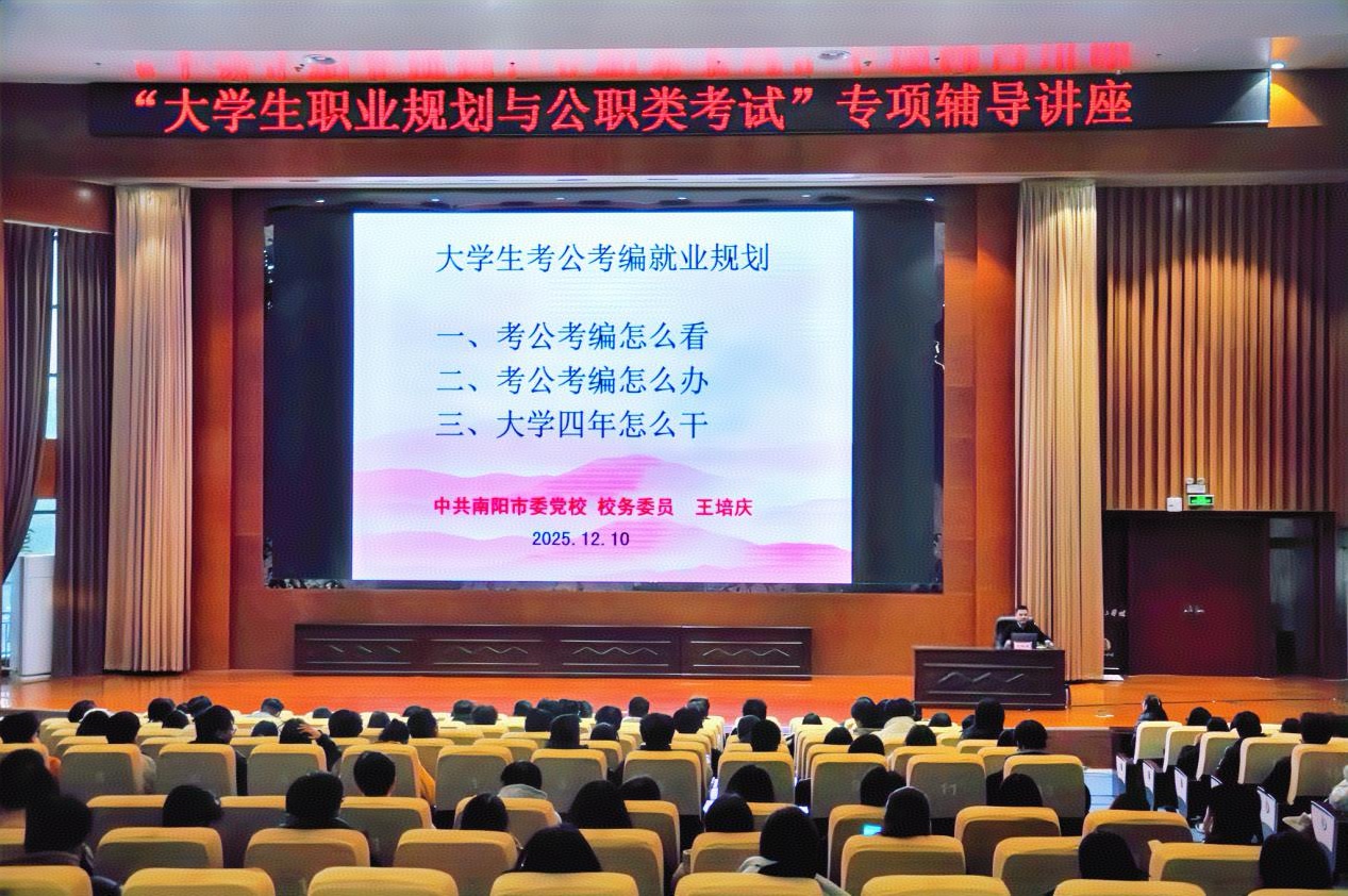 本网讯(特约记者/常雪瑞)12月10日,我校在第三报告厅举办“大学生职业规划与公职类考试”专项辅导讲座。讲座由南阳市委党校校务委员、南水北调干部学院特聘教授王培庆主讲,招生就业处统筹组织,全校各年级近400名同学参加。