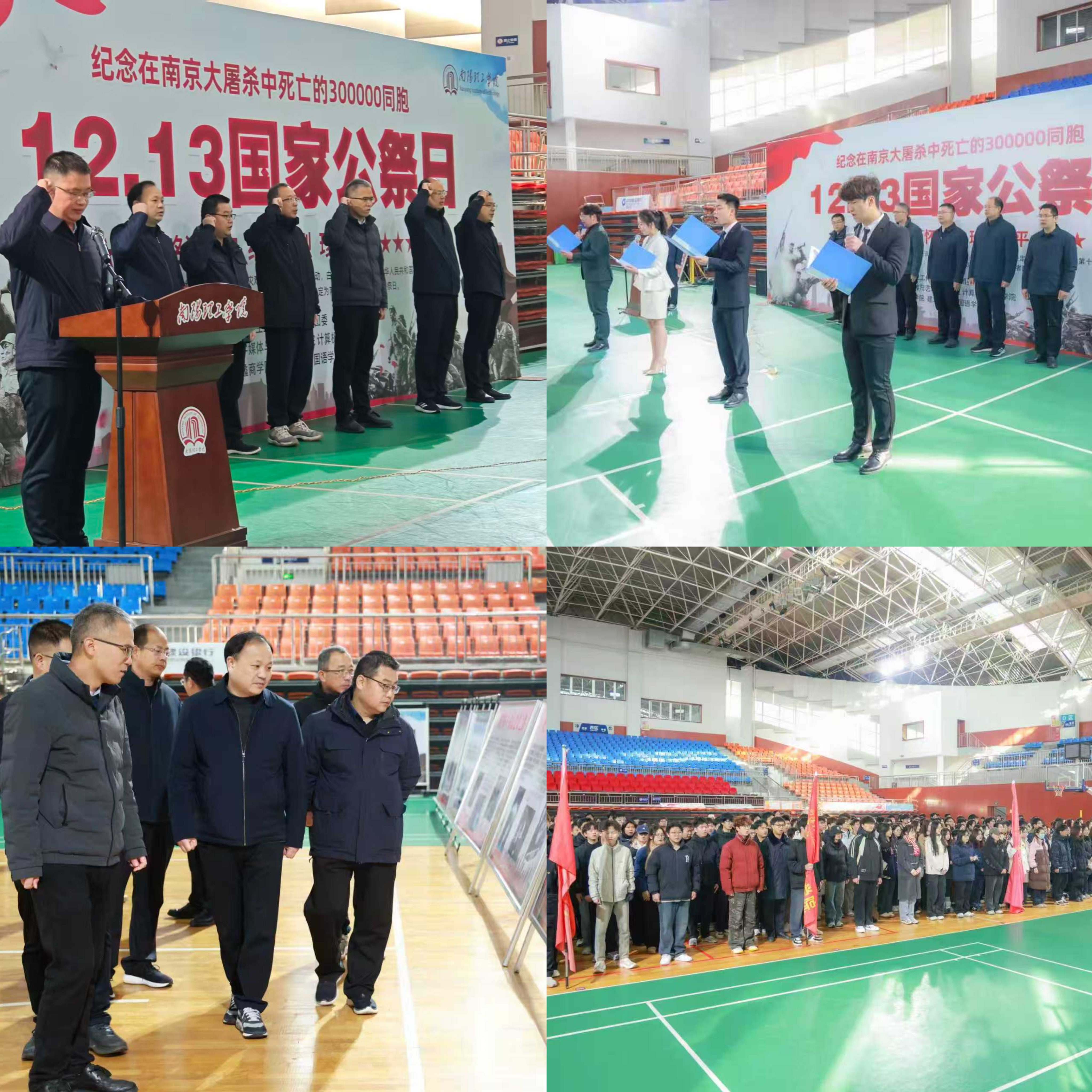本网讯(特约记者/陈苗苗)12月13日,是第十二个南京大屠杀死难者国家公祭日,为引导广大师生铭记历史、缅怀同胞、珍视和平、砥砺前行,厚植爱国主义情怀,我校在体育馆举行国家公祭日纪念活动。此次活动由党委学生工作部、团委主办,数字媒体与艺术设计学院、计算机与软件学院、范蠡商学院、建筑学院、外国语学院承办。