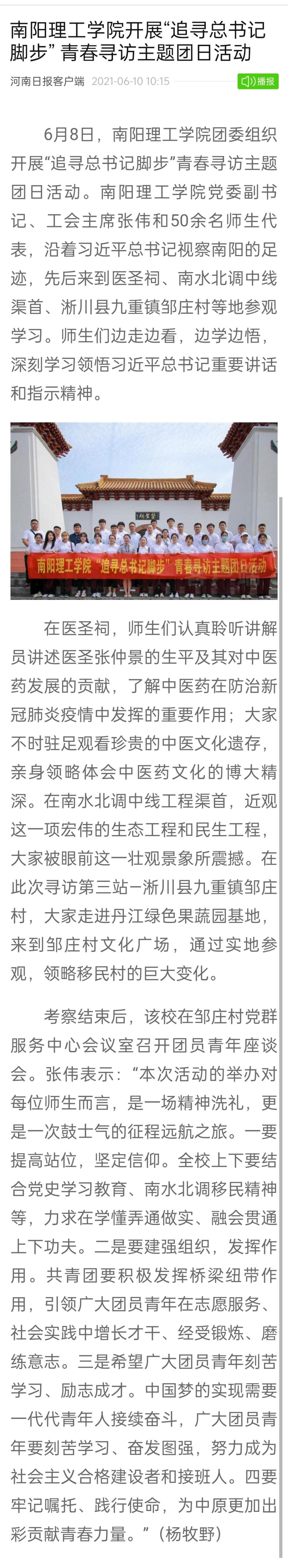 6月8日,南阳理工学院团委组织开展“追寻总书记脚步”青春寻访主题团日活动。南阳理工学院党委副书记、工会主席张伟和50余名师生代表,沿着习近平总书记视察南阳的足迹,先后来到医圣祠、南水北调中线渠首、淅川县九重镇邹庄村等地参观学习。师生们边走边看,边学边悟,深刻学习领悟习近平总书记重要讲话和指示精神。