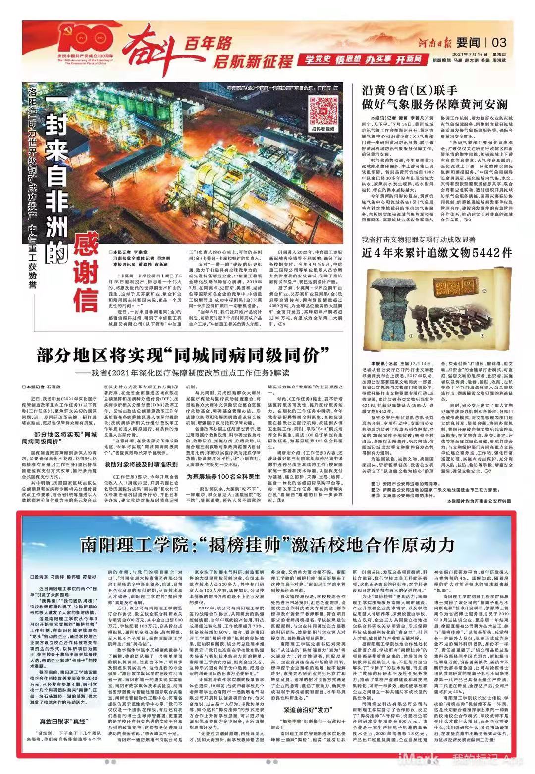 截至目前,南阳理工学院设置校企合作科技攻关专项资金2640万元,已经发布榜单4期,吸引学校十几个科研团队前来“揭榜”,正如一块石头激起一湖的涟漪,极大激发了校地合作的强劲活力。