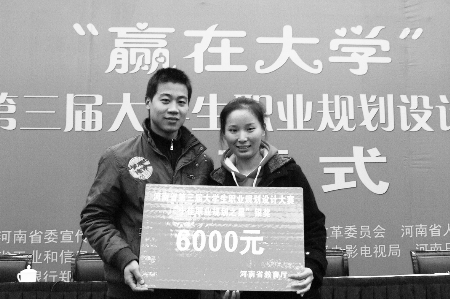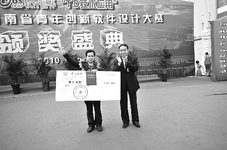副省长徐济超(右)向第四届河南省青年创新软件设计大赛金奖获得者陈永辉(左)颁发证书和奖金