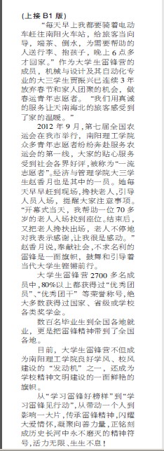 2012年9月,第七届全国农运会在我市举行,南阳理工学院众多青年志愿者纷纷奔赴服务农运会的第一线,大家的贴心服务受到社会各界好评,被称为“一流志愿者”。经济与管理学院大三学生赵香月也是其中的一员。她每天早早赶到现场,搀扶老人,引导人员入场,提醒大家注意事项。“开幕式当天,我帮助一位70多岁的老人入场找到座位。结束后,又把老人搀扶出场,老人不停地对我表示感谢,让我很是感动。”赵香月说,奉献社会,不求名利的雷锋是一面旗帜,鼓舞和引导着当代大学生铿锵前行。