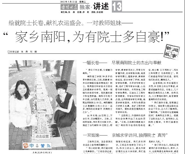16米长卷,18位院士,万余文字,百余幅图片。王杨、王雨两姐妹,用中英文对照文字,描述了当代南阳18位院士:哲学家、教育家冯友兰,甲骨文专家董作宾,农学家陈凤桐,地质学家冯景兰,建筑学家、教育家杨廷宝,语言学家丁声树,地质学家张炳熹,水声学专家杨士莪,选矿工程专家余永富,心血管专家朱晓东,水利发电工程专家张勇传,石油化工工程专家袁晴棠,半导体材料专家王占国,应用物理学家杜祥琬,地质学家张国伟,水利与资源动力学家王光谦,选矿工程专家刘炯天,塑料成型及模具技术专家申长雨。