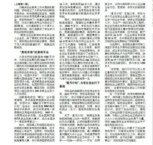 “星月计划”:为学生创业打下基础用长远的战略眼光关注学生的未来。2011年年初,学校全面启动“星月计划”,该计划要求全校所有院系均要加强与南阳市及周边地区重点企业的联系,积极探索校企深度合作的途径和方法,建立稳定、对等、密切的就业(见习)基地和创新创业基地。