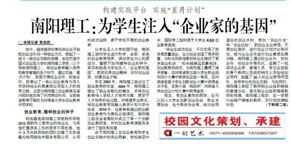 如今,越来越多的高校毕业生开始把创业当作另一种就业方式,掀起了一波又一波创业实践的浪潮。志在打造中国式创业型大学的南阳理工学院(以下简称南阳理工),将创业教育融入培养和教学管理的各个环节,通过实施“星月计划”,深度开展校企合作、校地合作,探索出了一条以创业教育与用人市场相结合的高素质应用型人才的培养之路。正因为南阳理工创业教育在省内较好地发挥了示范带动作用,日前被省教育厅确定为河南省大学生创业教育示范学校。