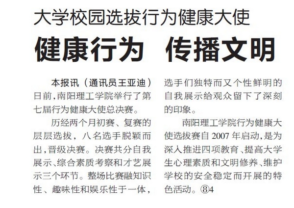 南阳理工学院行为健康大使选拔赛自2007年启动,是为深入推进四项教育、提高大学生心理素质和文明修养、维护学校的安全稳定而开展的特色活动。⑧4