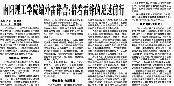 南阳理工学院党委书记刘建说:“雷锋精神是传承和践行社会主义核心价值体系的重要载体,对指导和激励大学生不断提高和完善自身素质及成长成才具有十分重要的意义。编外雷锋营是践行雷锋精神的优秀学生社团。”