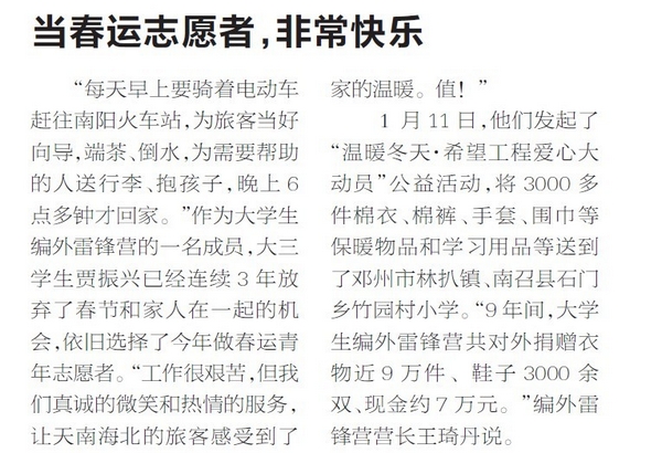 “每天早上要骑着电动车赶往南阳火车站,为旅客当好向导,端茶、倒水,为需要帮助的人送行李、抱孩子,晚上6点多钟才回家。”作为大学生编外雷锋营的一名成员,大三学生贾振兴已经连续3年放弃了春节和家人在一起的机会,依旧选择了今年做春运青年志愿者。“工作很艰苦,但我们真诚的微笑和热情的服务,让天南海北的旅客感受到了家的温暖。值!”