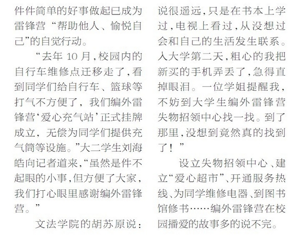 设立失物招领中心、建立“爱心超市”、开通服务热线、为同学维修电器、到图书馆修书……编外雷锋营在校园播爱的故事多的说不完。