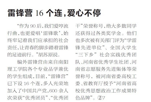 编外雷锋营由来自南阳理工学院各个专业品学兼优的学生组成,目前,“雷锋营”已下设16个连,多人光荣地加入了中国共产党,600余人次荣获“优秀团员”、“优秀团干”荣誉称号,绝大多数同学还获得过各类奖学金。他们也多次被有关部门评为“学雷锋先进单位”、全国大学生“三下乡”社会实践优秀团队、河南省优秀学生社团、河南省志愿服务先进集体等荣誉称号,被河南省委高校工委、省教育厅授予“河南省高校优秀思想政治工作成果特色品牌”。②7