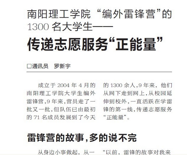 成立于2004年4月的南阳理工学院大学生编外雷锋营,9年来,营员走了一批又一批,但队伍已由最初的71名成员发展到了今天的1300余人,9年来,他们从网下走到网上,从校园延伸到校外,一直活跃在学雷锋的第一线,传递志愿服务“正能量”。