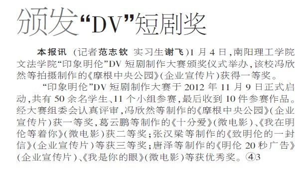 本报讯 (记者范志钦 实习生谢飞)1月4日,南阳理工学院文法学院“印象明伦”DV短剧制作大赛颁奖仪式举办,该校冯欣然等拍摄制作的《摩根中央公园》(企业宣传片)获得一等奖。