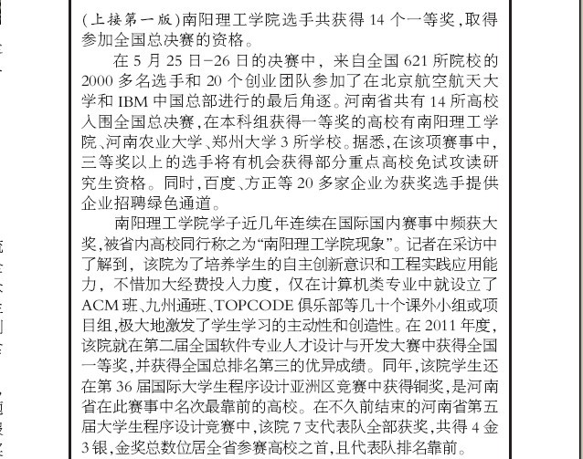 南阳理工学院学子近几年连续在国际国内赛事中频获大奖,被省内高校同行称之为“南阳理工学院现象”。记者在采访中了解到,该院为了培养学生的自主创新意识和工程实践应用能力,不惜加大经费投入力度,仅在计算机类专业中就设立了ACM班、九州通班、TOPCODE俱乐部等几十个课外小组或项目组,极大地激发了学生学习的主动性和创造性。在2011年度,该院就在第二届全国软件专业人才设计与开发大赛中获得全国一等奖,并获得全国总排名第三的优异成绩。同年,该院学生还在第36届国际大学生程序设计亚洲区竞赛中获得铜奖,是河南省在此赛事中名次最靠前的高校。在不久前结束的河南省第五届大学生程序设计竞赛中,该院7支代表队全部获奖,共得4金3银,金奖总数位居全省参赛高校之首,且代表队排名靠前。