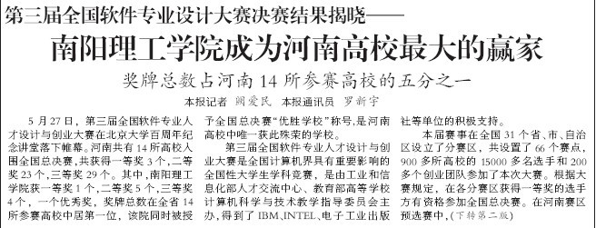 5月27日,第三届全国软件专业人才设计与创业大赛在北京大学百周年纪念讲堂落下帷幕。河南共有14所高校入围全国总决赛,共获得一等奖3个,二等奖23个,三等奖29个。其中,南阳理工学院获一等奖1个,二等奖5个,三等奖4个,一个优秀奖,奖牌总数在全省14所参赛高校中居第一位,该院同时被授予全国总决赛“优胜学校”称号,是河南高校中唯一获此殊荣的学校。