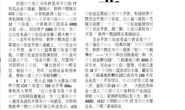 4月5日,投入近150万元装备的软件学院iOS实验室的100台苹果iMac一体机投入使用。“这在全省也是不多见的!”刘黎明自豪地说。为了让更多的学生感受先进技术带来的不同感受,刘黎明和软件学院的老师们早已形成共识:iOS实验室近期就会对学生开放,形成软件学院完全开放的实验室,这在省内高校中无疑又创造了一个第一。“实验室能做到对学生完全开放,据了解,在全国高校也不多见。”软件学院副院长张晓民说。