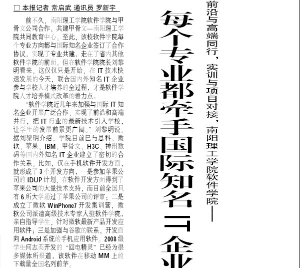 “软件学院近几年来加强与国际IT知名企业开展广泛合作,实现了前沿和高端并行,把IT行业的最新技术引入学校,让学生的发展前景更广阔。”刘黎明说。据刘黎明介绍,学院目前已与思科、微软、苹果、IBM、甲骨文、H3C、神州数码等国内外知名IT企业建立了密切的合作关系。比如,仅在手机软件开发方面,就形成了3个开发方向,一是参加苹果公司的IDUP计划,在软件开发方面得到了苹果公司的大量技术支持,而目前全国只有6所大学通过了苹果公司的评审;二是成立了微软WinPhone7开发集训营,微软公司派遣高级技术专家入驻软件学院,亲自指导学生,针对微软最新产品开发应用软件;三是加强与谷歌的联系,开发面向Android系统的手机应用软件。2008级学生何志英开发的“回电精灵”已经为很多媒体所报道,该软件在移动MM上的下载量全国名列前茅。