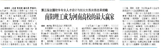 本报讯(记者 常启武 通讯员 罗新宇)5月27日,第三届全国软件专业人才设计与创业大赛在北京大学百周年纪念讲堂落下帷幕。我省共有14所高校入围全国总决赛,共获得一等奖3个、二等奖23个、三等奖29个。其中,南阳理工学院获一等奖1个、二等奖5个、三等奖4个、优秀奖1个,奖牌总数在全省14所参赛高校中居第一位。该院同时被授予全国总决赛“优胜学校”称号,是河南高校中唯一获此殊荣的学校。